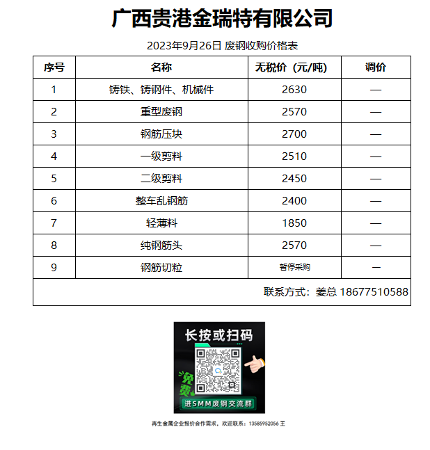 今日广西贵港金瑞特 废钢收购报价已更新,有货的朋友欢迎联系我们!