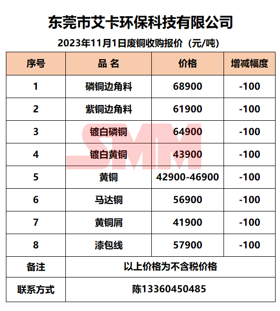 11月1日东莞艾卡 废铜收购报价