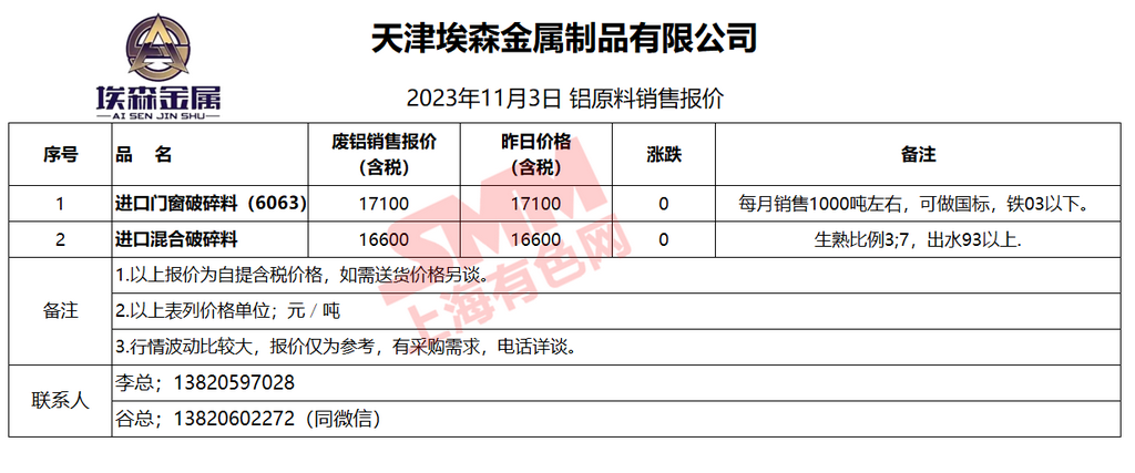 11月3日天津埃森 废铝销售报价