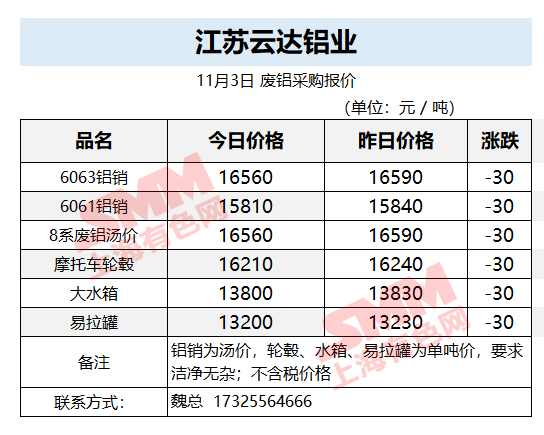 11月3日江苏云达铝业 废铝采购报价