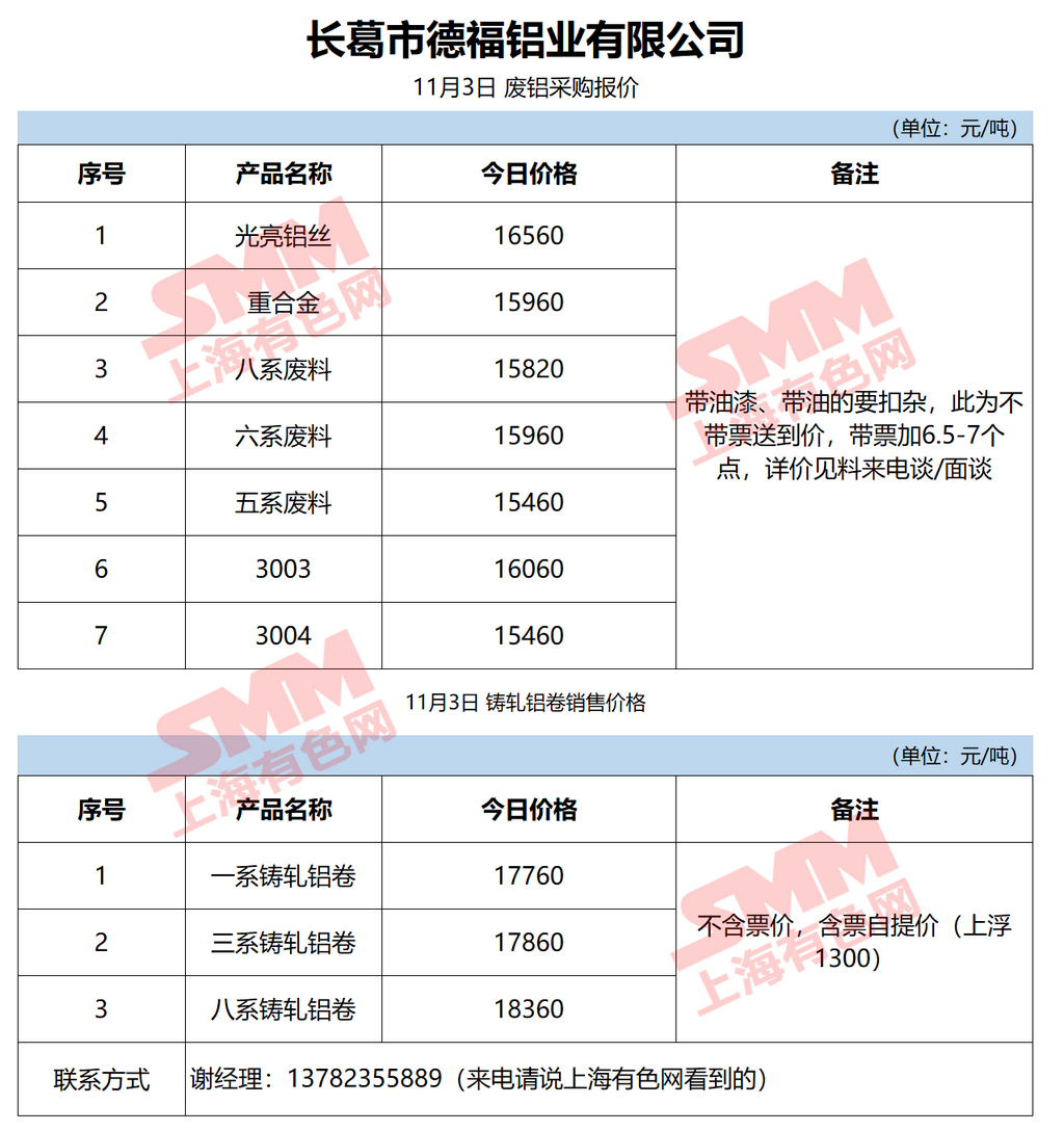 11月3日长葛德福铝业 废铝采购报价
