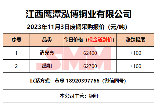 11月3日江西鹰潭泓博铜业 废铜采购报价