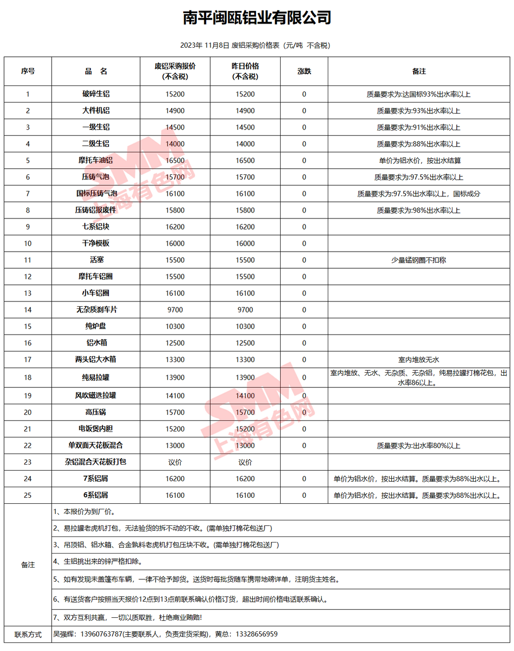 11月8日南平闽瓯 废铝采购报价