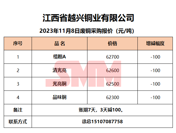 今日江西越兴,废铜采购报价已更新,有货的朋友欢迎联系我们!