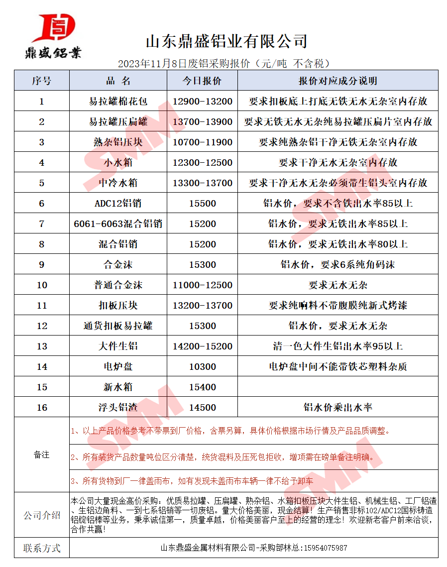 11月8日山东鼎盛 废铝采购报价