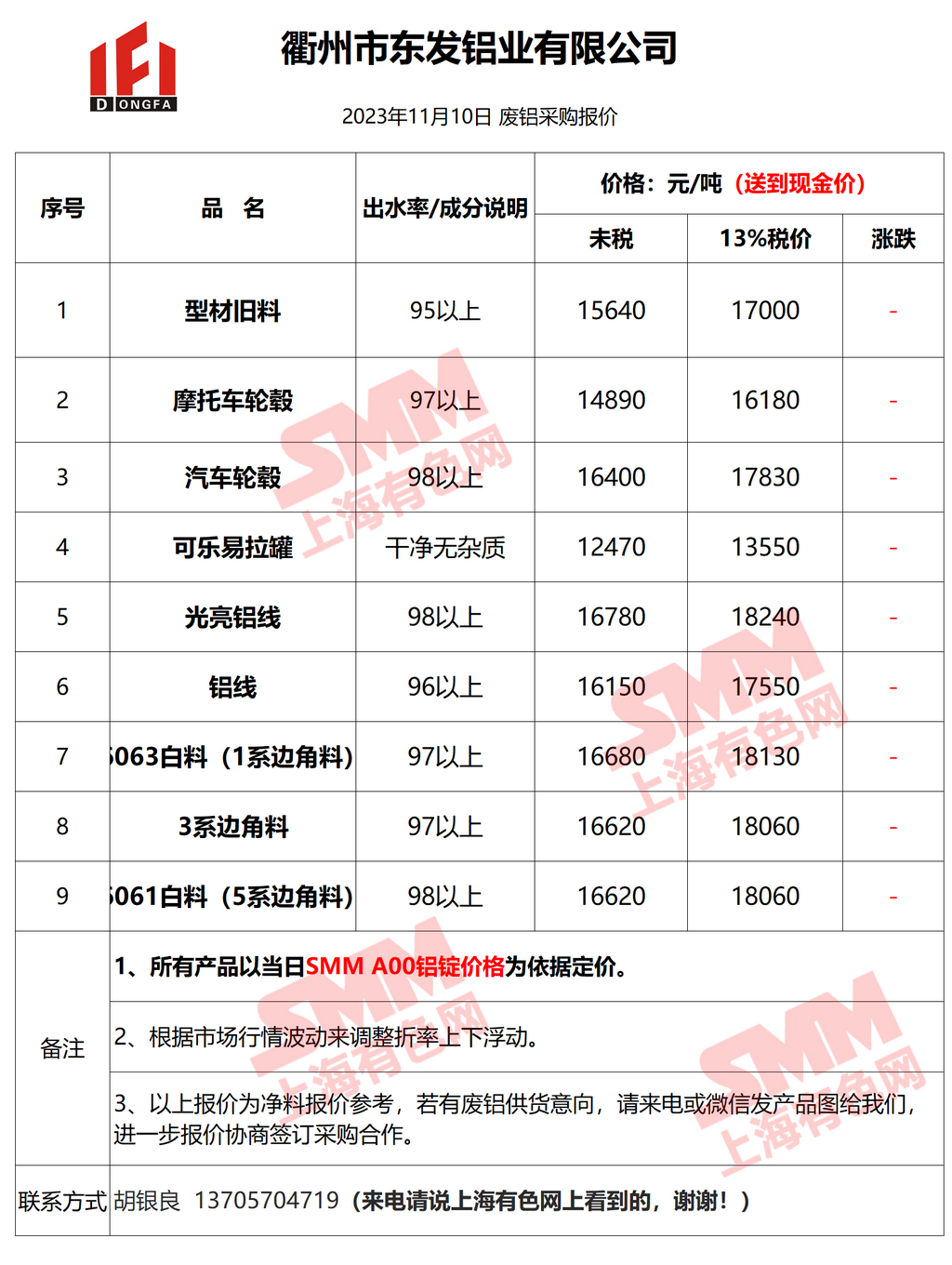 今日衢州东发 废铝采购报价已更新,有货的朋友欢迎联系我们!