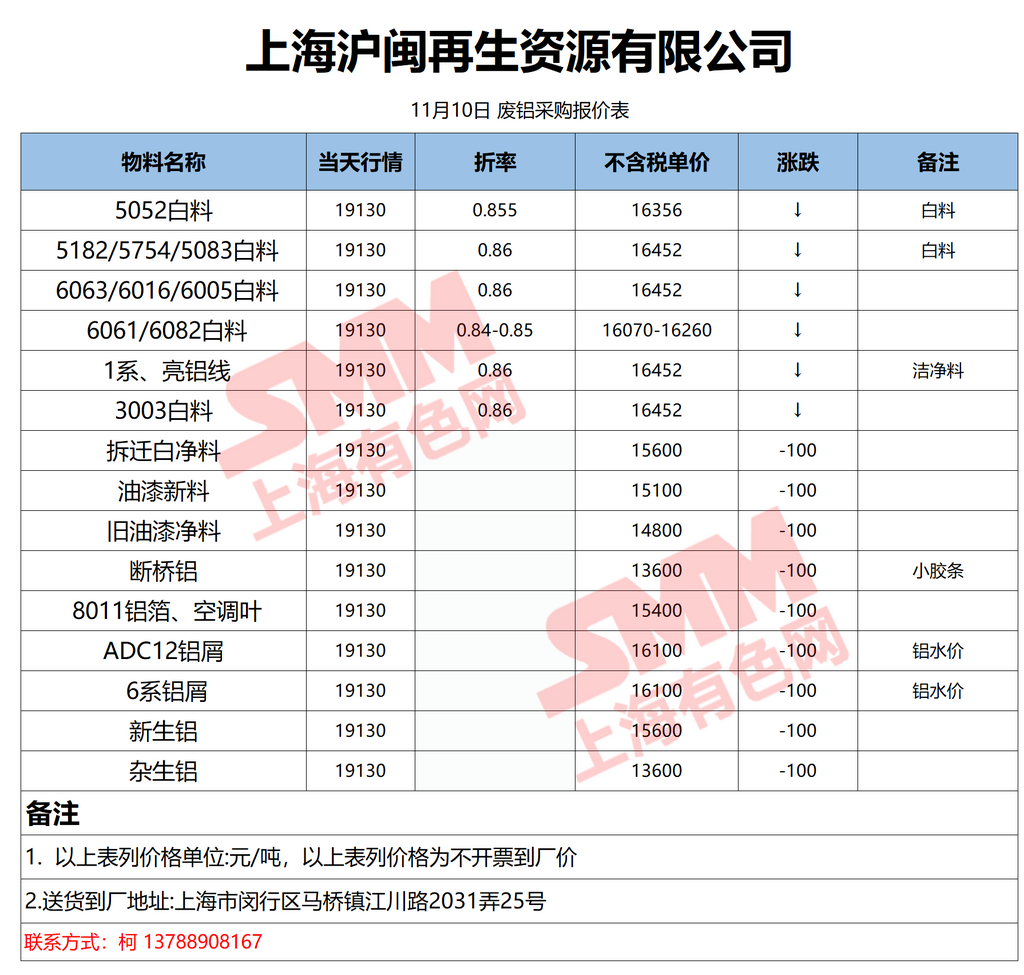 11月10日上海沪闽 废铝采购报价
