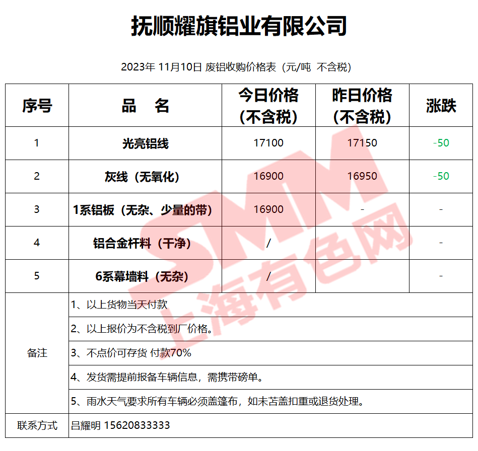 11月10日抚顺耀旗 废铝采购报价