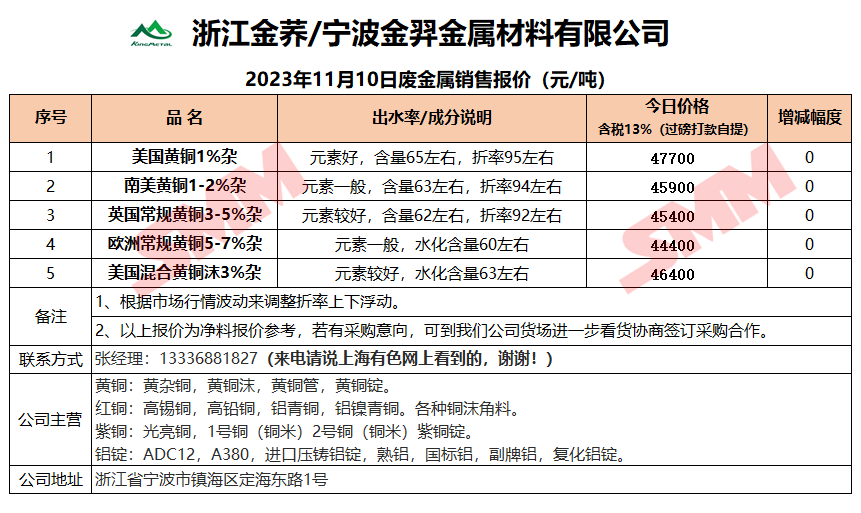 11月10日浙江金荞/宁波金羿 废铜销售报价