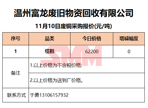 11月10日温州富龙废旧 废铜采购报价