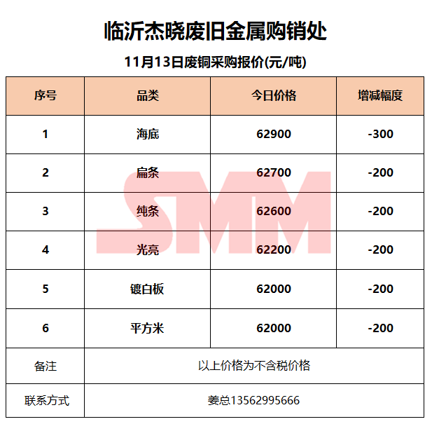 11月13日临沂杰晓 废铜采购报价