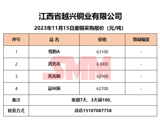 今日江西越兴,废铜采购报价已更新,有货的朋友欢迎联系我们!