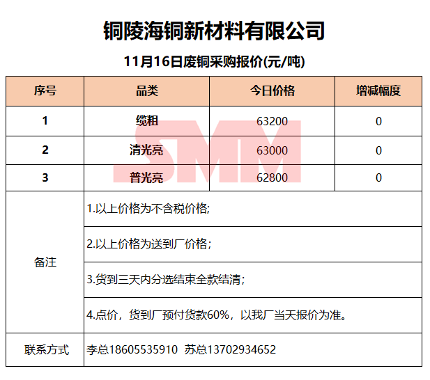 11月16日铜陵海铜 废铜采购报价