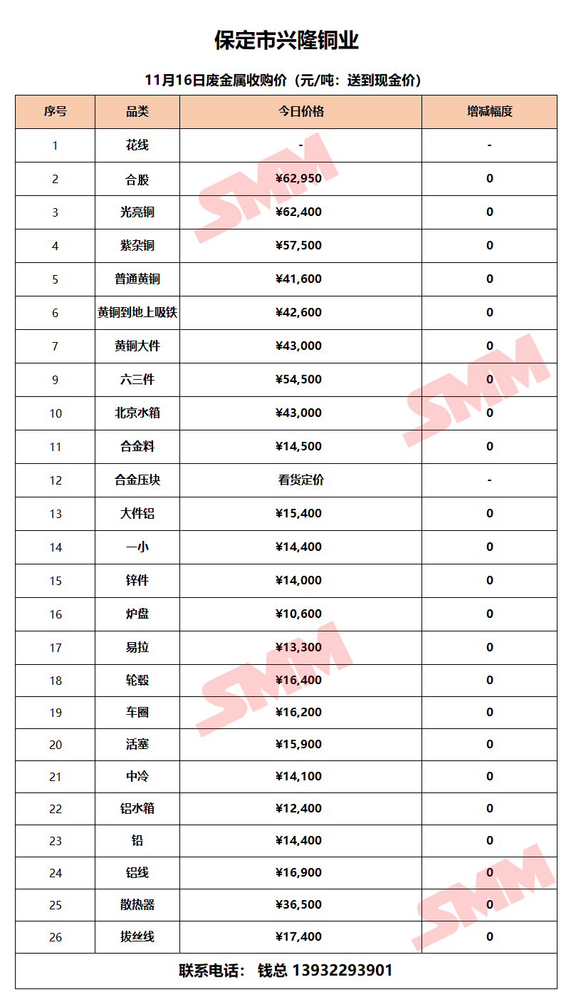 今日保定兴隆铜业,废金属收购报价已更新,有货的朋友欢迎联系我们!