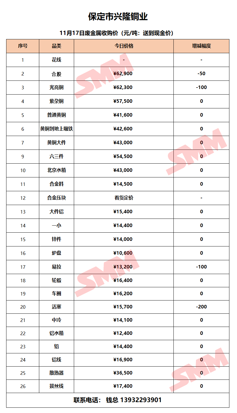 11月17日保定兴隆铜业 废金属收购报价