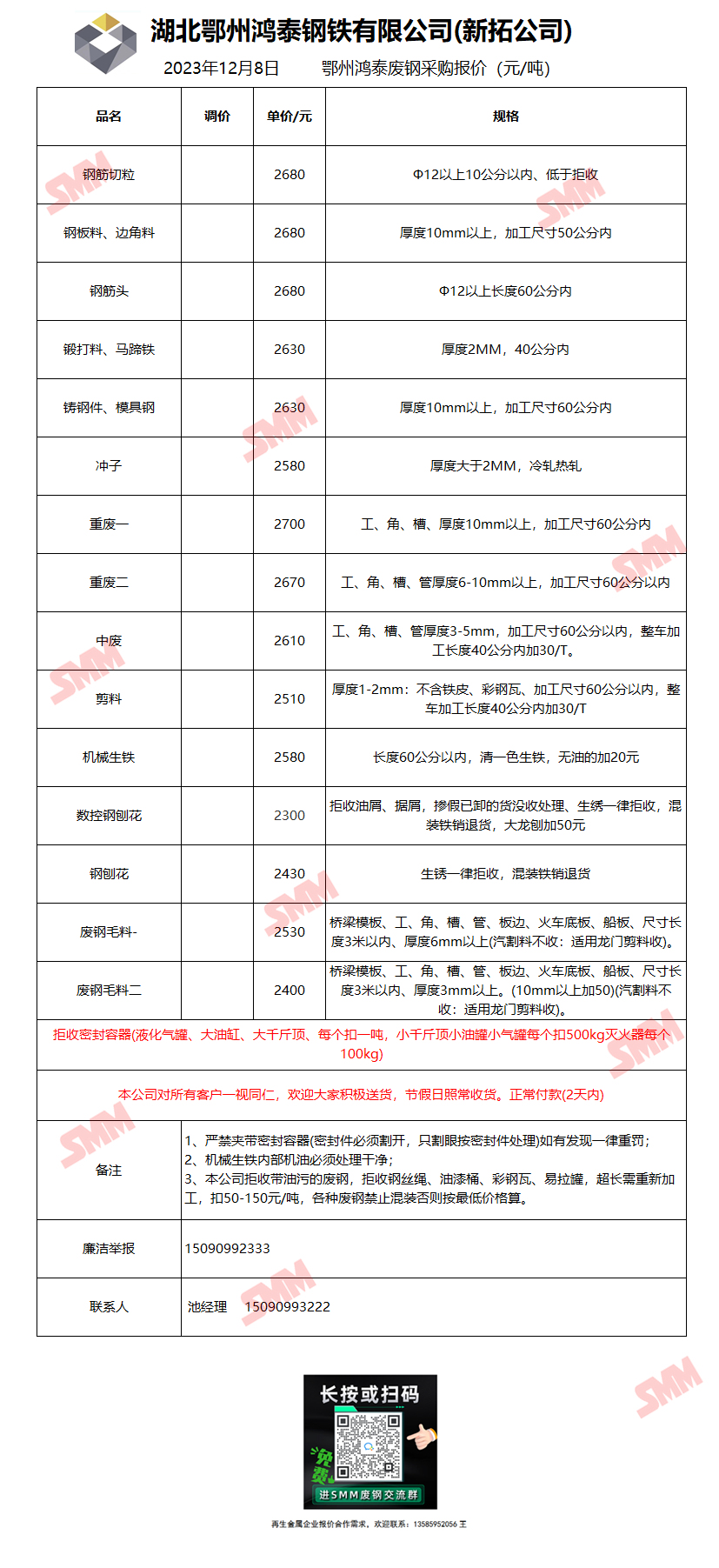 12月8日湖北鄂州鸿泰 废钢采购报价