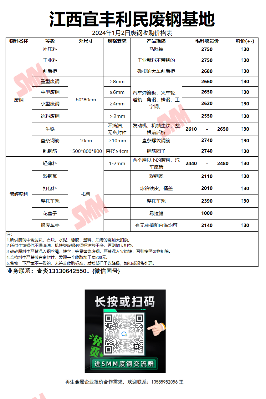 1月2日(13时30分)宜丰利民 废钢收购报价