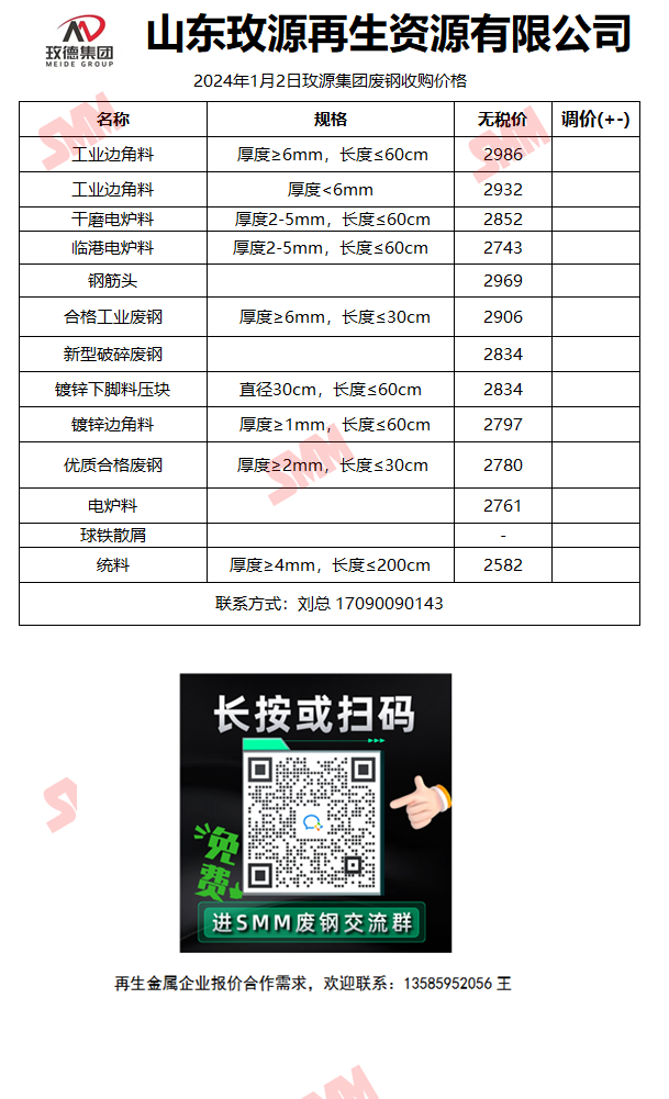 1月3日山东玫源再生 废钢收购报价