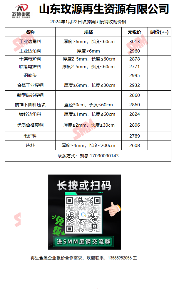 1月23日山东玫源再生 废钢收购报价