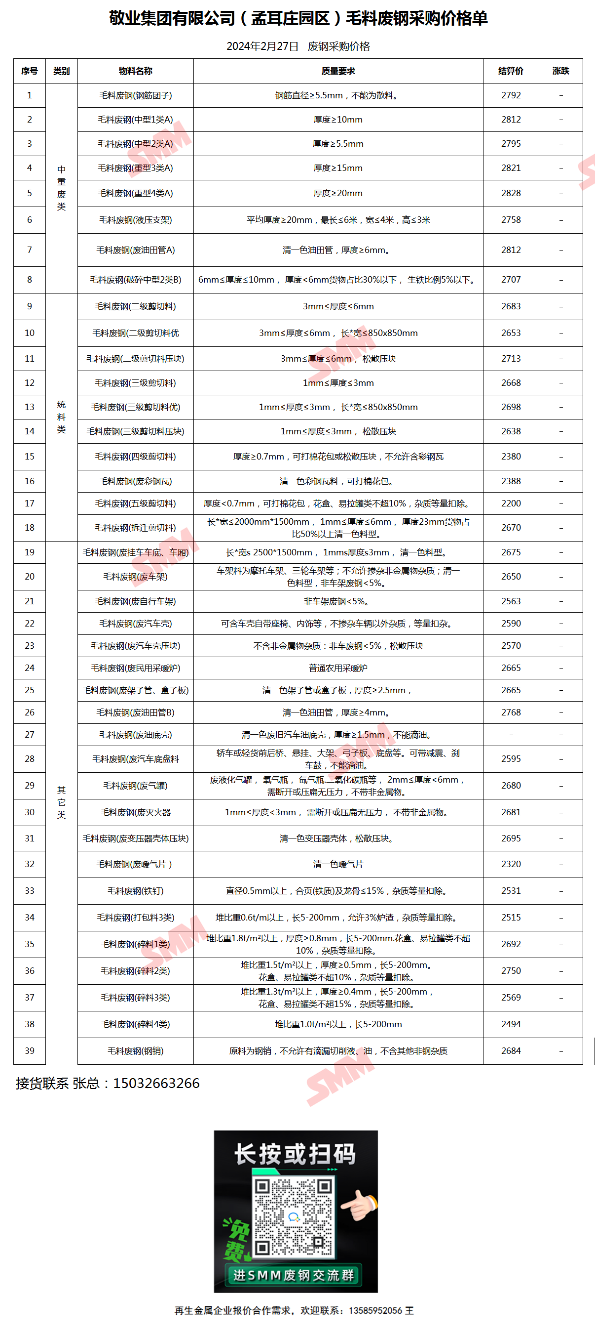2月27日敬业钢铁(孟耳庄园区) 废钢采购报价