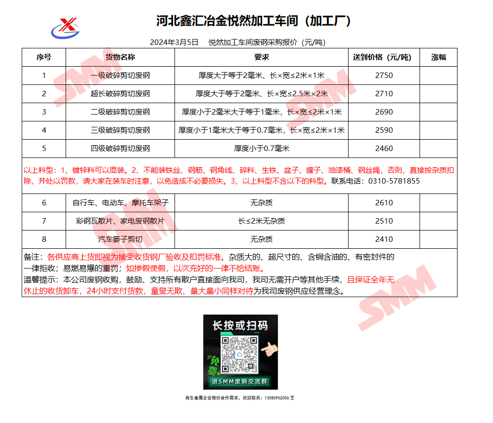 3月5日河北鑫汇冶金悦然加工车间 废钢采购报价