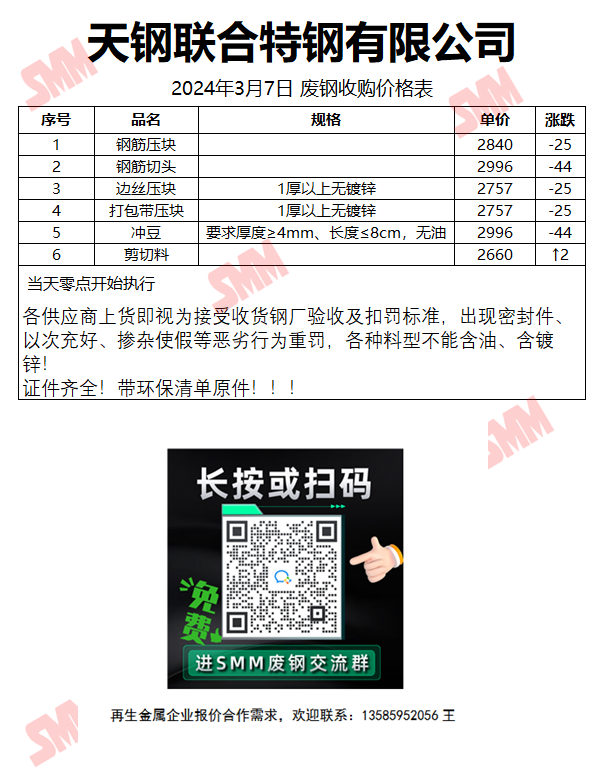 今日天钢联合特钢 废钢收购报价已更新,有货的朋友欢迎联系我们!