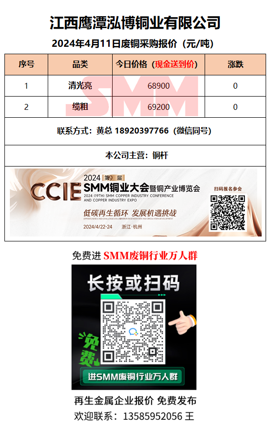 4月11日江西鹰潭泓博铜业 废铜采购报价