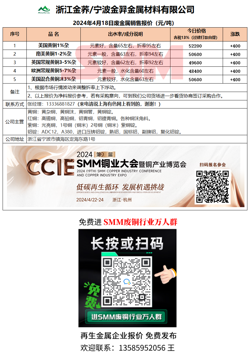 4月18日浙江金荞 宁波金羿 废铜销售报价