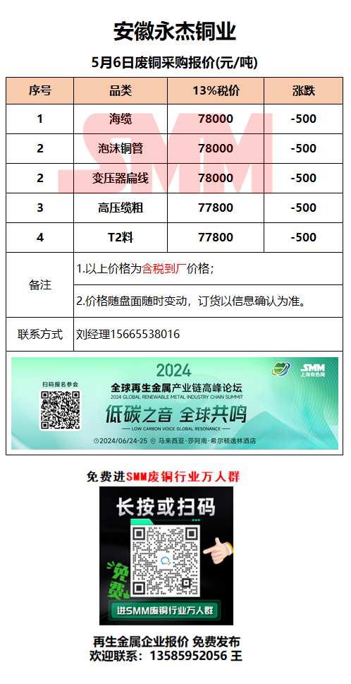 今日安徽永杰 废铜采购报价已更新,有货的朋友欢迎联系我们!
