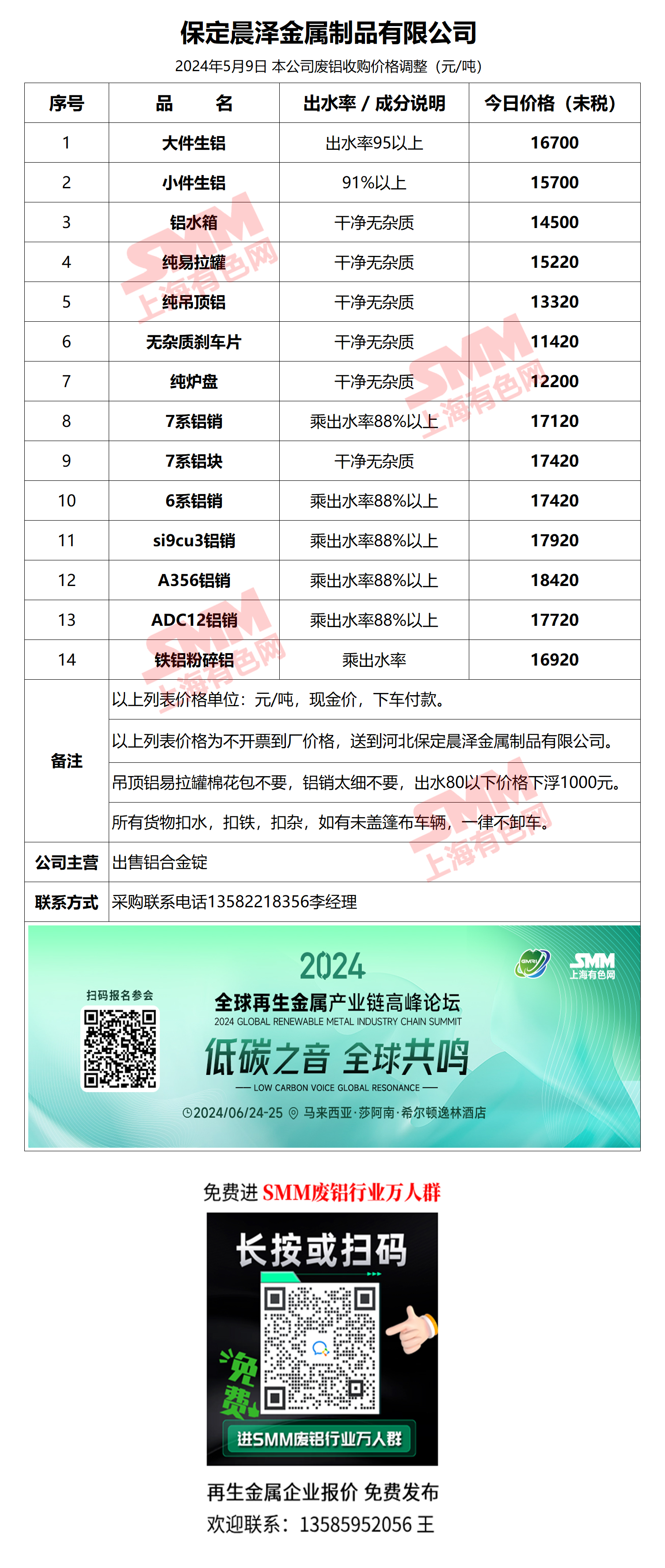 今日保定晨泽 废铝采购报价已更新,有货的朋友欢迎联系我们!