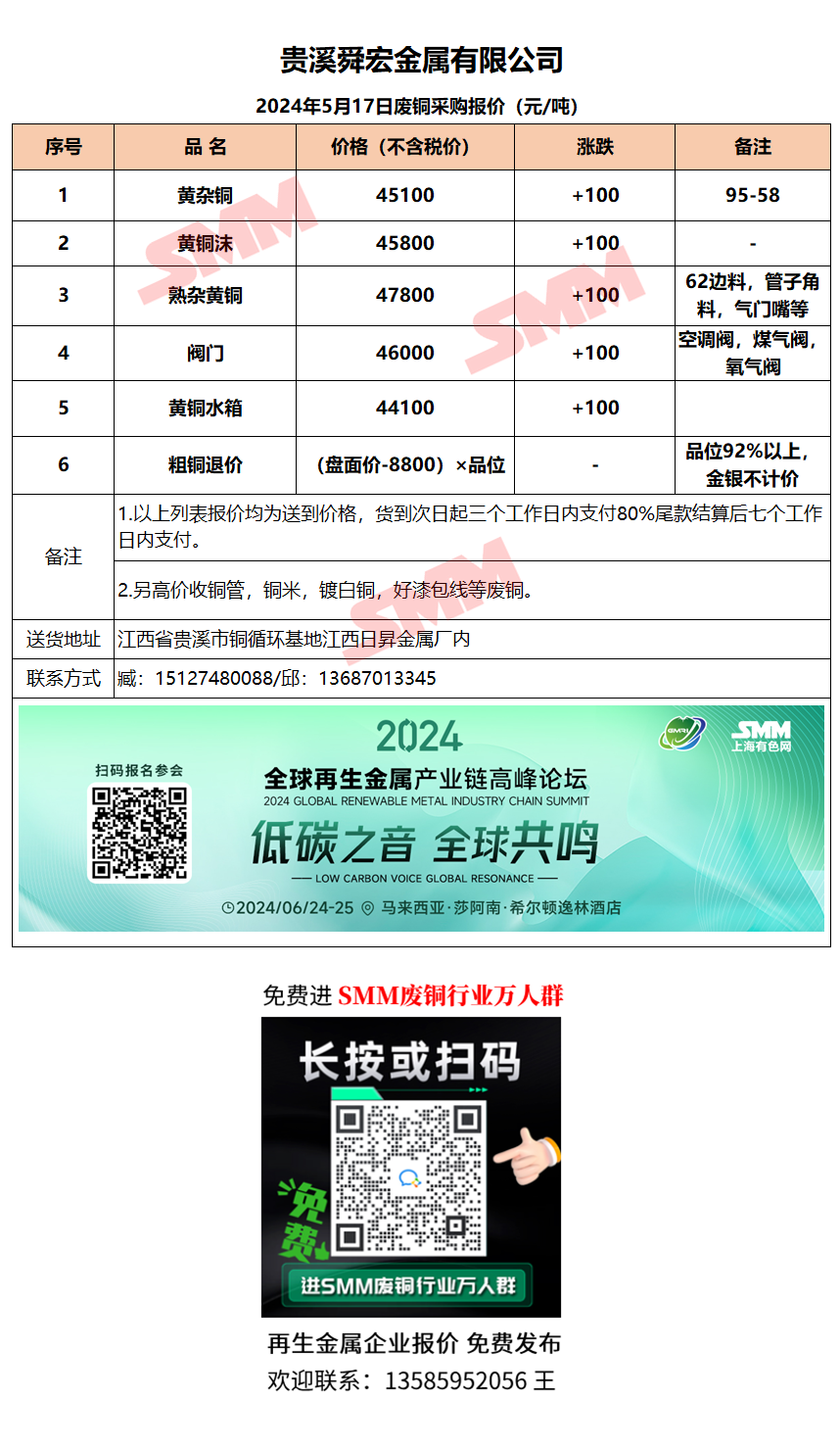 今日贵溪舜宏 废铜采购报价已更新,有货的朋友欢迎联系我们!