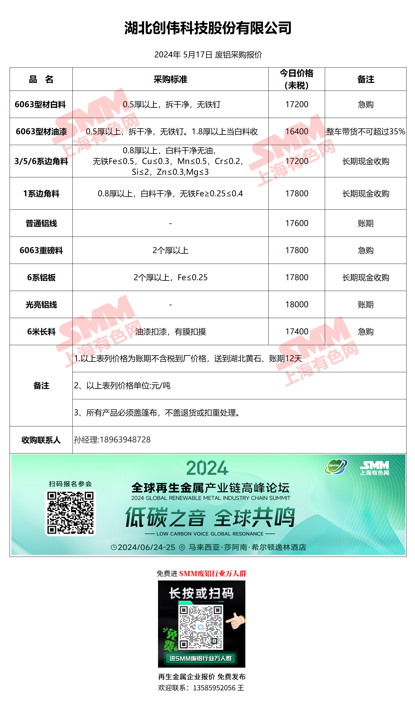 今日创伟科技 废铝采购报价已更新,有货的朋友欢迎联系我们!