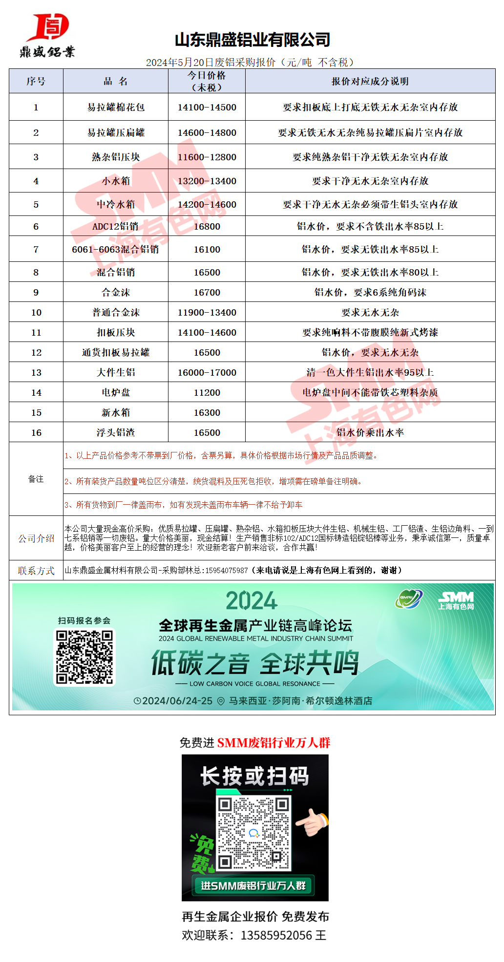 今日山东鼎盛 废铝采购报价已更新,有货的朋友欢迎联系我们!