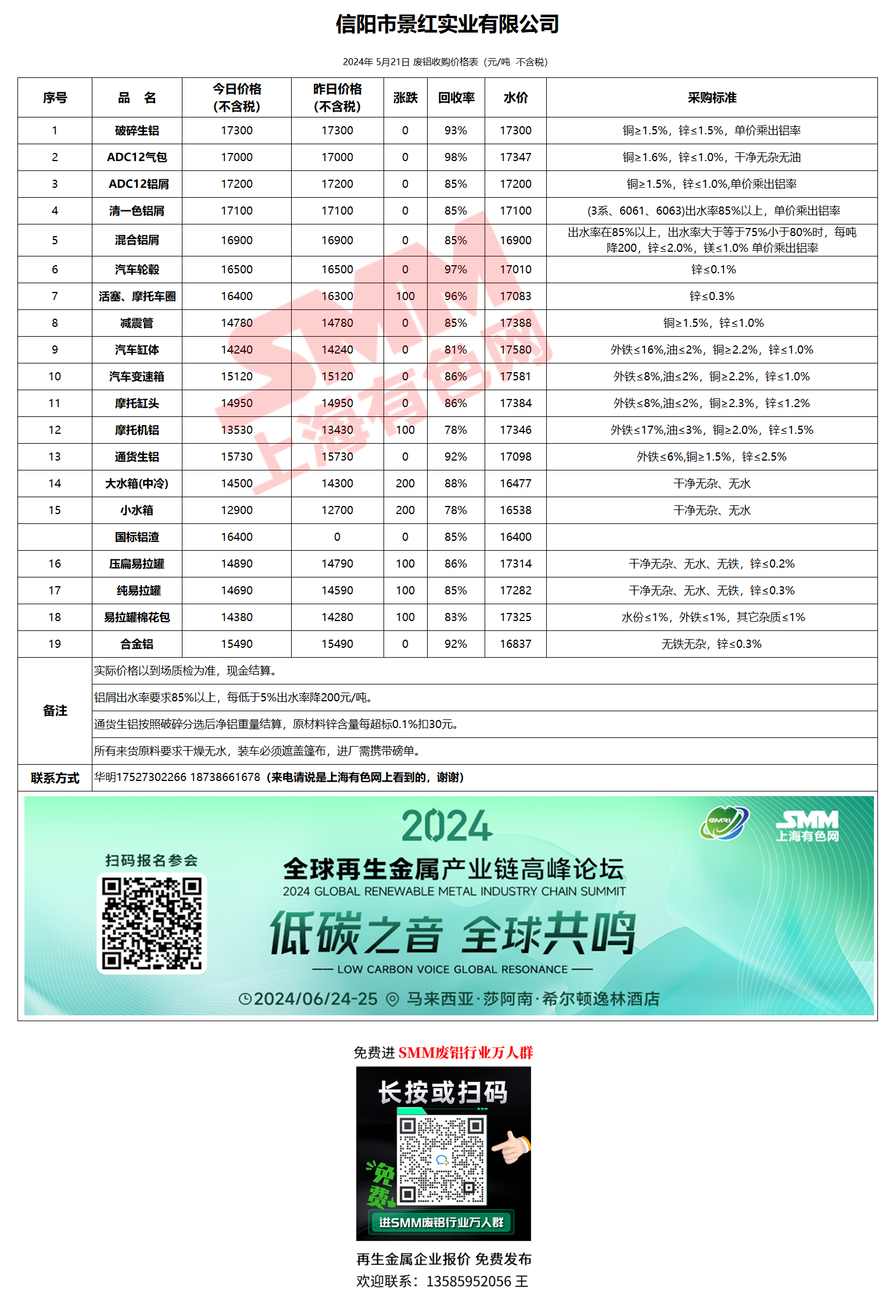 5月21日河南景红 废铝采购报价