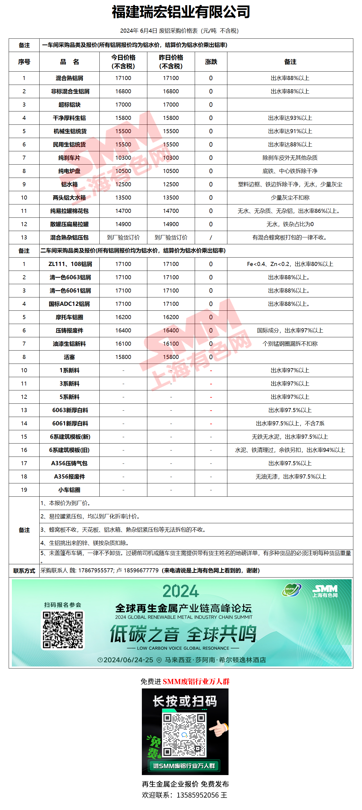6月4日福建瑞宏 废铝采购报价