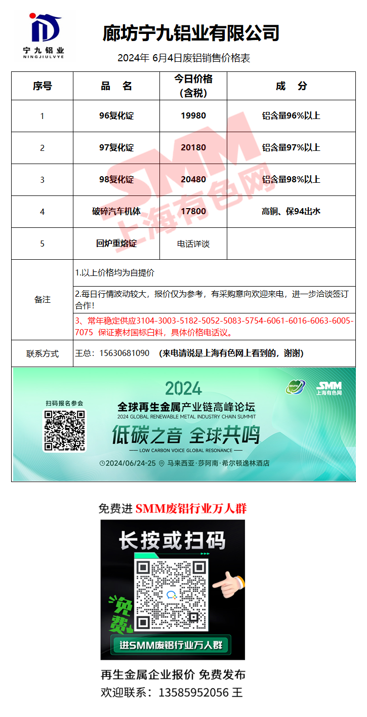 6月4日宁九铝业 废铝销售报价