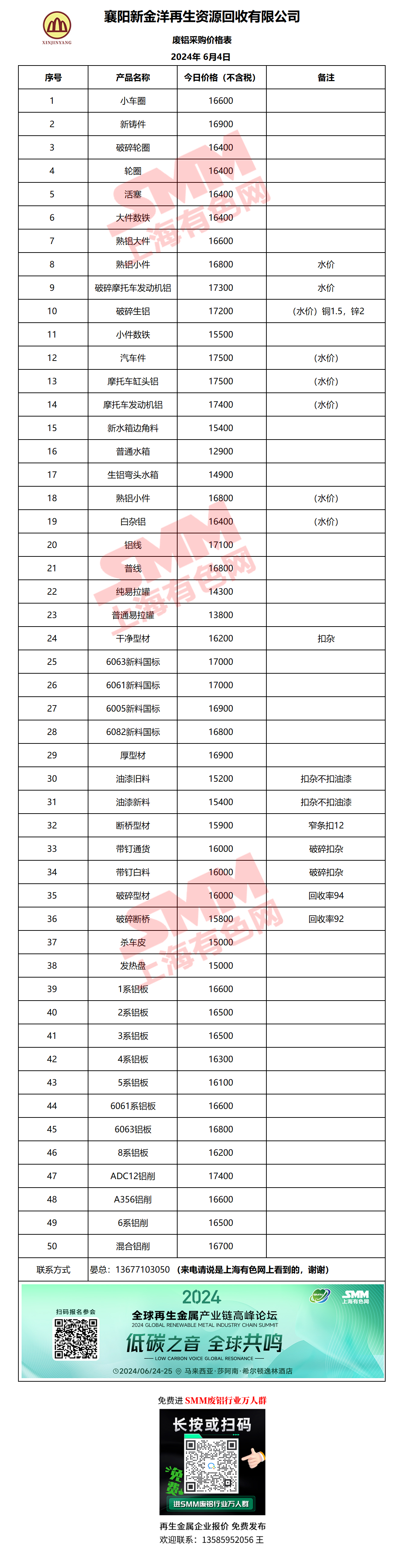 6月4日襄阳新金洋 废铝采购报价