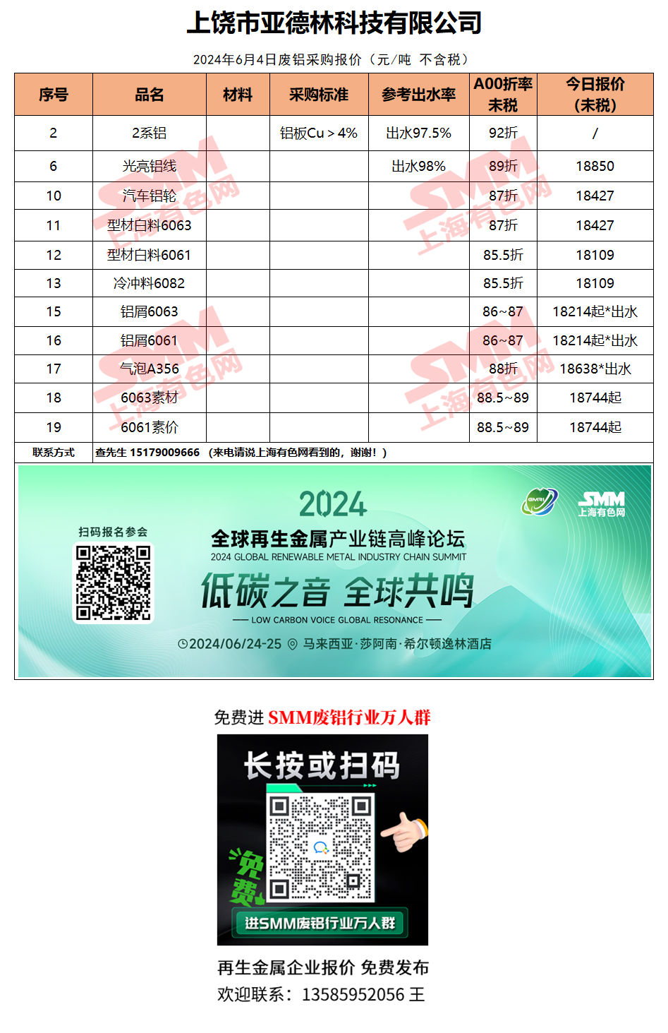 6月4日上饶市亚德林 废铝采购报价