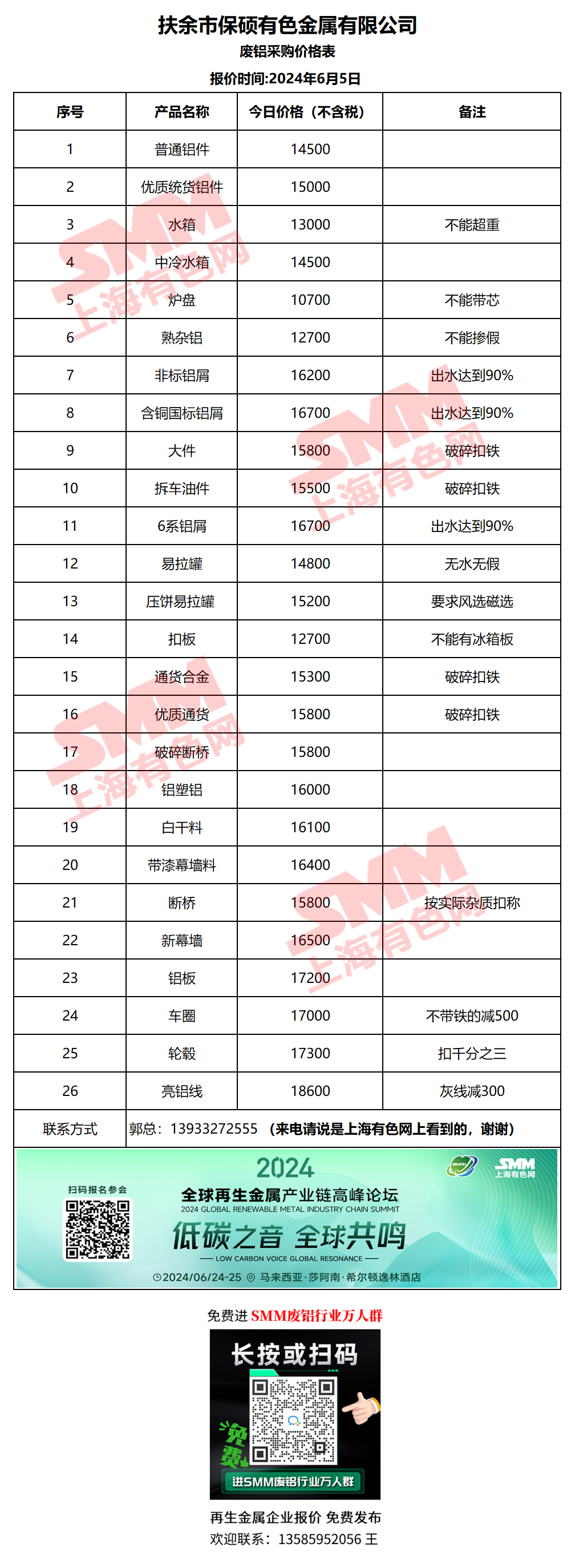 6月5日保硕金属 废铝采购报价