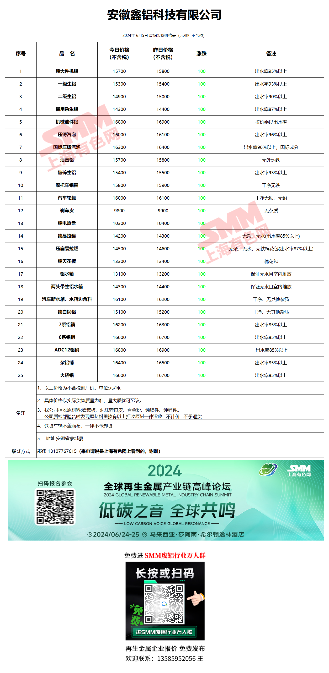6月5日安徽鑫铝 废铝采购报价