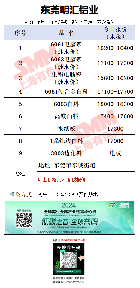 6月5日东莞明汇铝业 废铝采购报价
