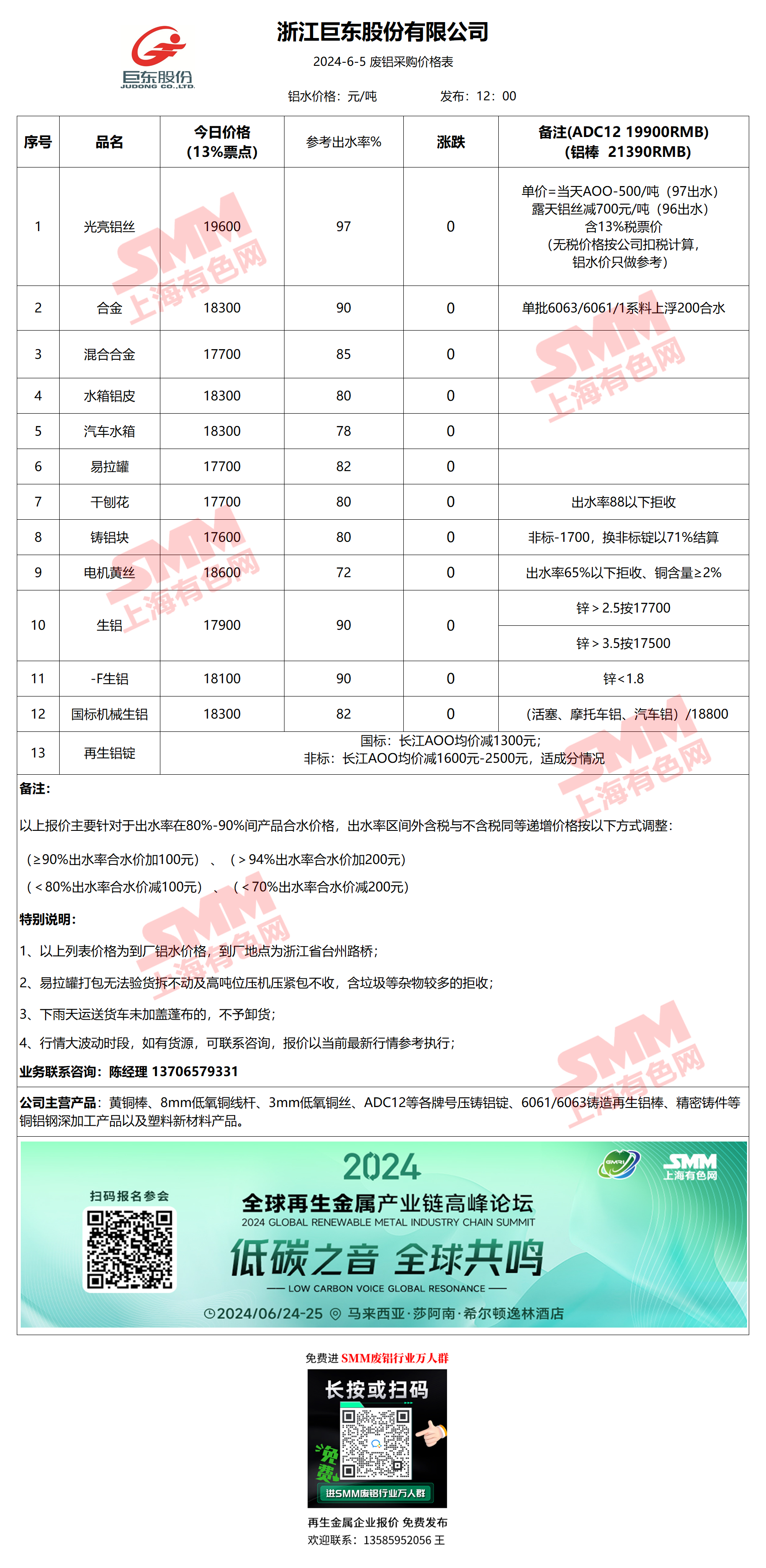 今日浙江巨东 废铝采购报价已更新,有货的朋友欢迎联系我们!