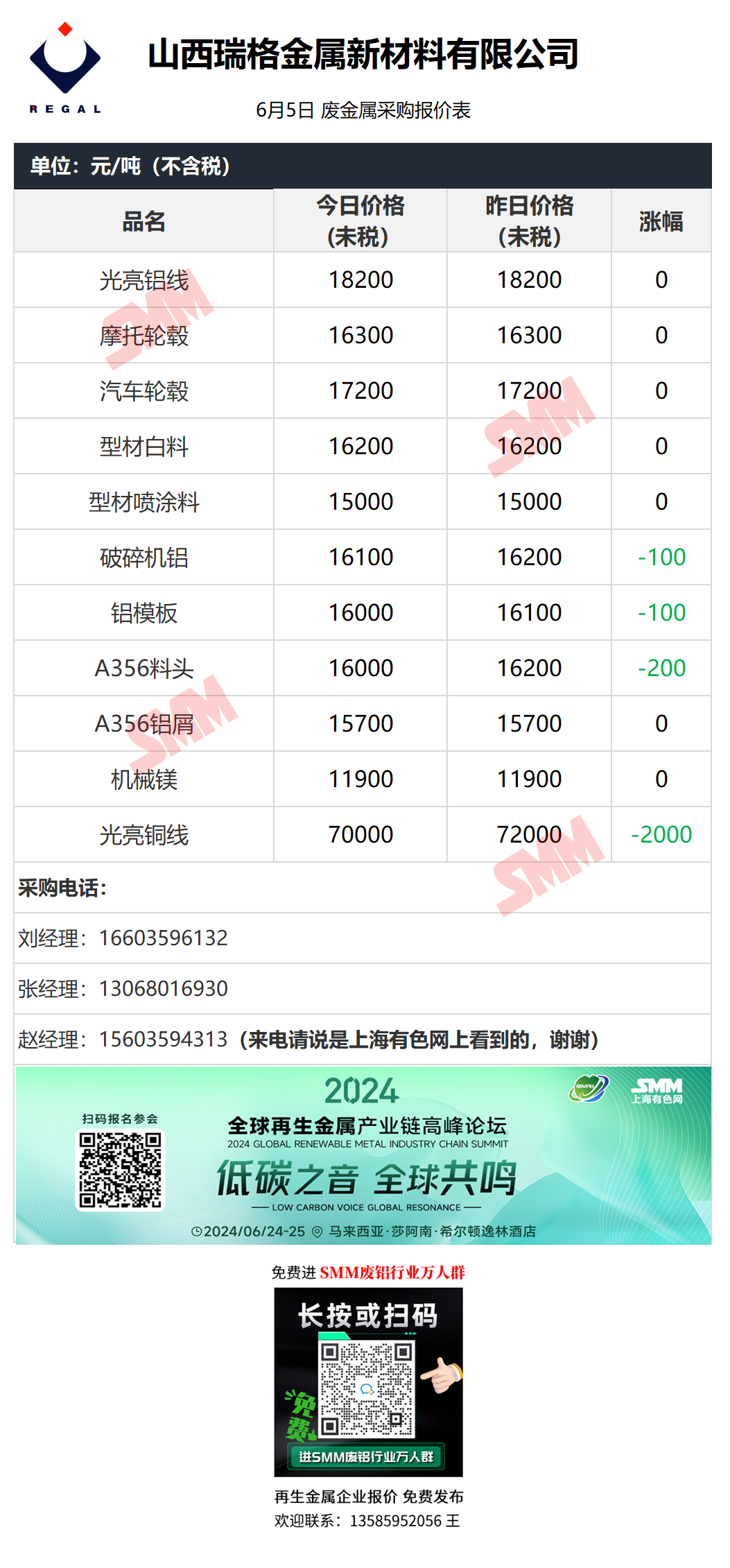 今日瑞格金属 废铝采购报价已更新,有货的朋友欢迎联系我们!