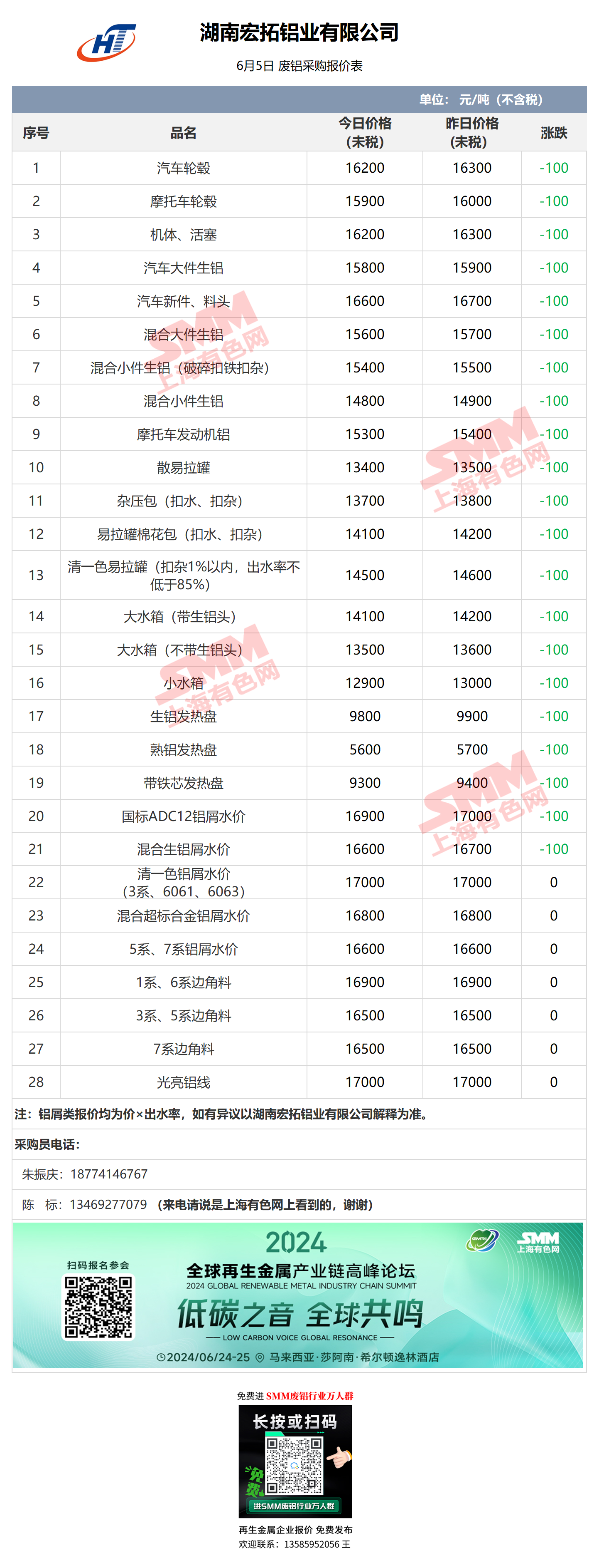 6月5日湖南宏拓铝业 废铝采购报价