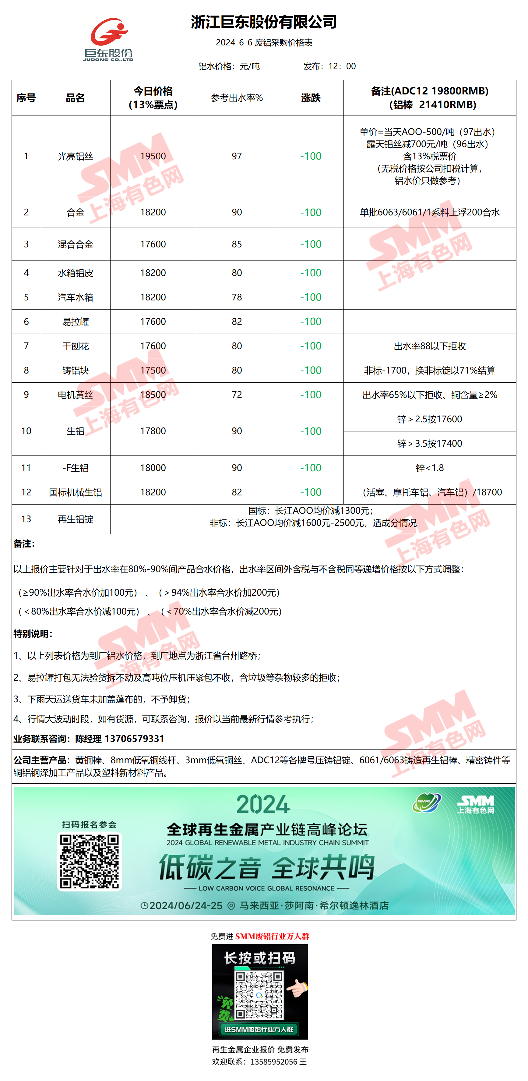 6月6日浙江巨东 废铝采购报价