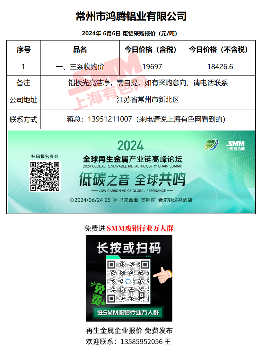 6月6日鸿腾铝业 废铝采购报价