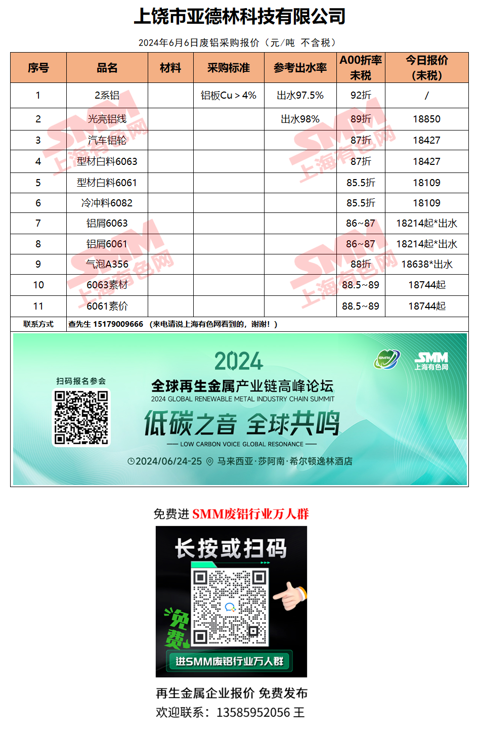 6月6日上饶市亚德林 废铝采购报价