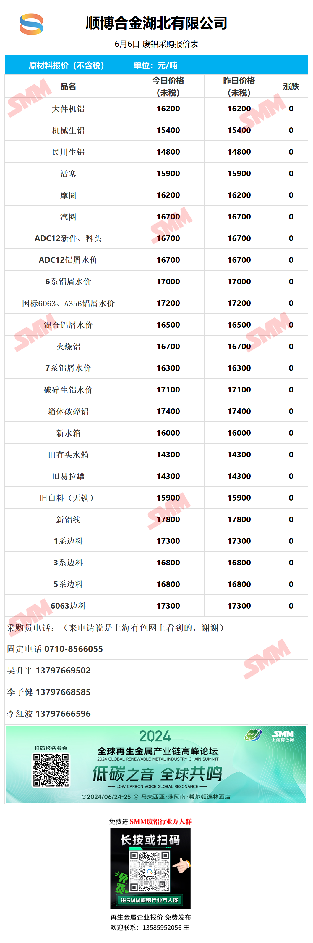 6月6日顺博合金湖北 废铝采购报价