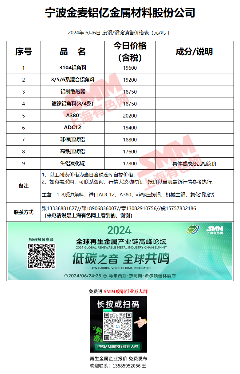 6月6日宁波金麦 废铝销售报价
