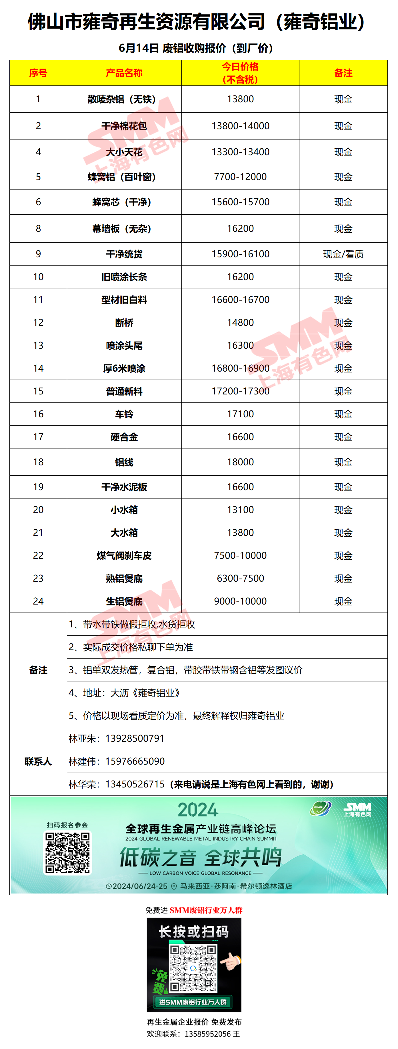 今日佛山雍奇 废铝采购报价已更新,有货的朋友欢迎联系我们!